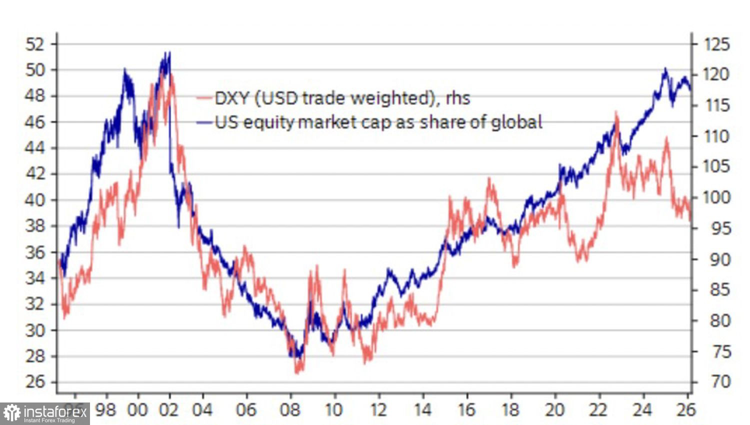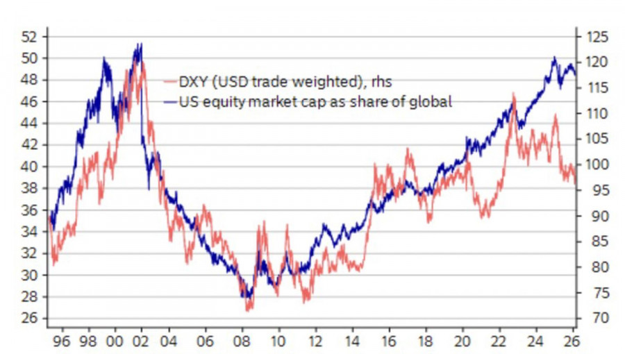 Как и информация Министерства финансов об увеличении покупок эмитированных в США ценных бумаг нерезидентами с $1,18 трлн в 2024 до $1,55 трлн в 2025. По мнению BNY, основной причиной стало ослабление гринбэка после введения Белым домом тарифов на День освобождения Америки. Иностранные инвесторы тут же начали скупать изрядно подешевевшие бумаги. Это привело к стабилизации индекса USD во втором полугодии. В начале 2026 он чаще растет, чем падает.