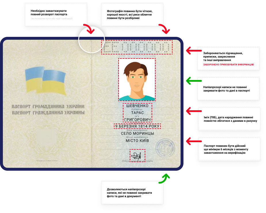 7. Документ повинен бути дійсним на момент запиту (термін дії посвідчень особи повинен закінчуватися не менше, ніж через 6 місяців з дня подачі заявки на верифікацію), а також містити всі належні печатки та підписи.